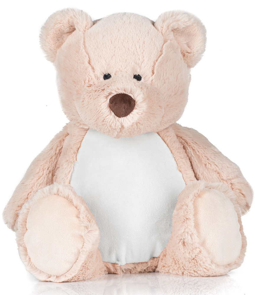 100% polyester. Soft plush mid brown bear. Sewn eyes. Contrast brown nose. White coloured panel on tummy and feet. Removable inner pad. Zip access for decoration onto front panel. Suitable for embroidery, print and sublimation.
